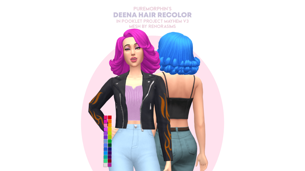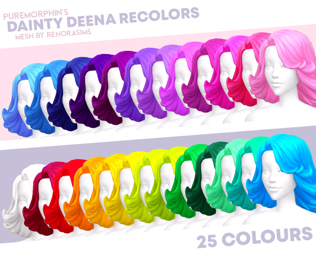 25 recolours of Renorasims' Dainty Deena hair for The Sims 4. I made this recolour because the hairstyle was the best option I've seen so far that matches the hairstyle of Jayde from The Urbz. I used the colours from Pooklet's Project Mayhem v3, as well one custom purple I made to match Jayde.